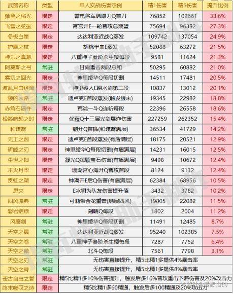 从上表中可以看出,天空系列武器的精炼收益是最低的,这些武器精5之后对伤害的提升甚至还不到10%。