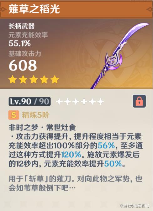 薙草之稻光作为雷电将军的专武,同时也是所有五星武器中精炼收益最高的武器,以雷电将军的大招首段为例,精5薙刀的伤害要比精1薙刀的伤害高33.6%,这个提升比例还是非常夸张的。