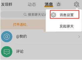 1、首先打开微博,点击消息,点击右上角设置图标。