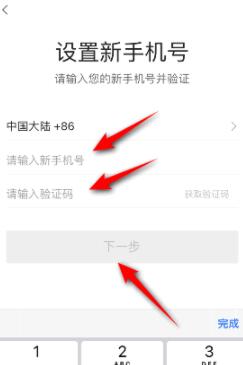 4、然后输入新的手机号,之后输入验证码,点击下一步,这样便可以更换绑定的手机号。