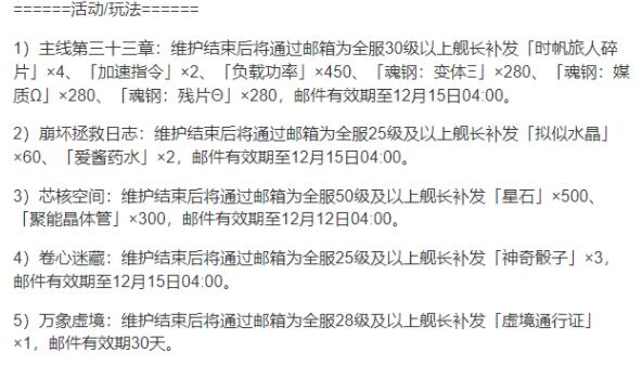 维护结束之后会对30级以上的玩家们发放,4片时帆旅人碎片、2个加速指令、450的负载功率、280个魂钢变体Ξ、280个魂钢媒质Ω、280个魂钢残片Θ。