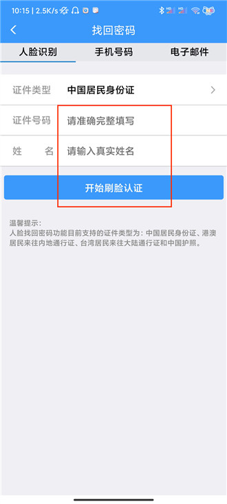 3、输入证件号码与姓名,点击开始刷脸认证。