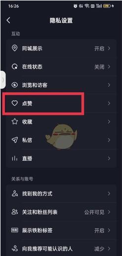 4、进入到隐私设置的页面之后点击【点赞】;