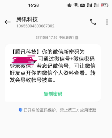 最后成功找回密码成功的短信截图