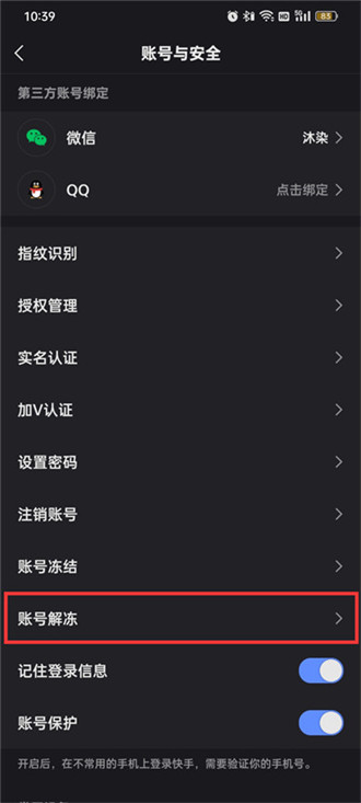 4.最后来到账号与安全的页面中点击【账号解冻】之后跟随着提示来操作即可;