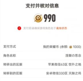 6、最后大家需要之分990(99¥)荣耀币,支付成功之后账号就会开始转移了
