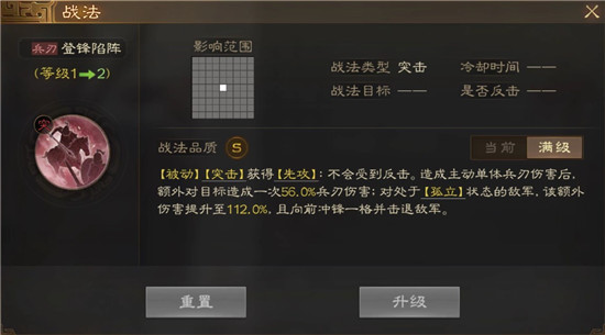 [被动] [突击]获得[先攻]:不会受到反击。造成主动单体兵刃伤害后。领外对目标造成一次56.0%兵刀伤害:对处于[孤立]状态的敌军,该额外伤害提升至112.0%,且向前冲锋一格并击退敌军。