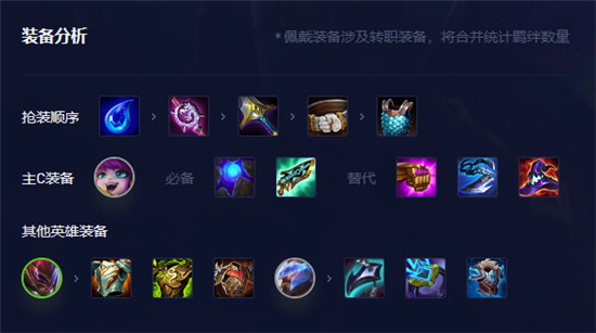 装备上优先蓝霸符,其次是科技枪刃,前排装备有啥合成啥,离子、日炎、龙牙石像鬼等都可(连败不上装备)。