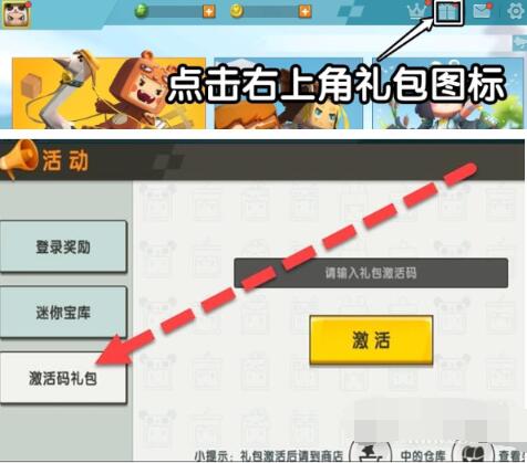 打开迷你世界,点击右上角的礼物盒,点击活动选项,点击激活码礼包按钮即可兑换。