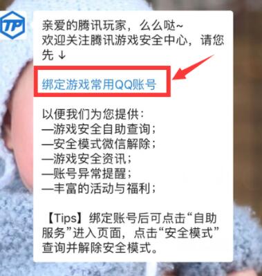 2、公众号关注之后进入它的主页面,这时系统会发来一条推送,我们点击推送中的“绑定游戏常用QQ账号”。