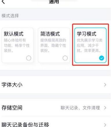 在通用设置的界面中,用户可以看到学习模式的功能选项,点击即可进入学习模式。