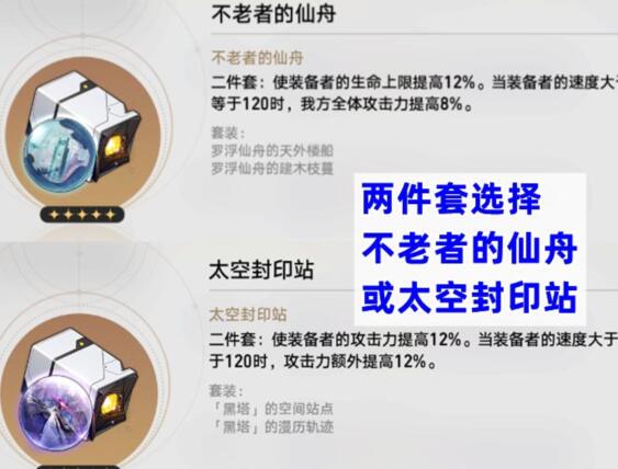 两件套推荐太空封印站或者不老者的仙舟。个人更推荐仙舟套,因为罗刹的治疗量是绝对足够的,封印站的24%攻击力属于锦上添花,相比之下仙舟的全体加攻击能辅助队友,加12%生命也能增强罗刹自身的生存。不过考虑到这两套都在同一个副本掉落,刷到词条合适的就先用那一套。